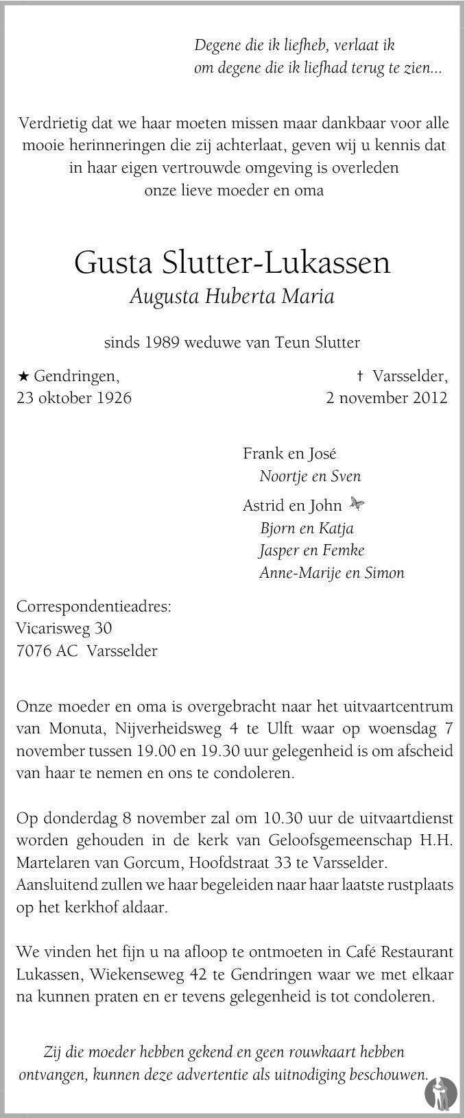 Antonius Johannes (Teun) Slutter is geboren op 20-08-1924 in Varsselder Veldhunten (Oude IJsselstreek), zoon van Gradus Johannes Slutter en Anna Gesina van Aalst. Teun is overleden op 19-09-1989, 65 jaar oud. Hij is begraven in Varsselder RK kerkkhof. Teun trouwde met Gusta Lukassen. Gusta is geboren op 23-10-1926. Gusta is overleden op 02-11-2012, 86 jaar oud. Zij is begraven in Varsselder RK kerkkhof.