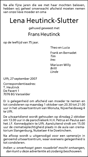 Helene Maria (Lena) Slutter is geboren op 23-07-1932 in Etten (Oude IJsselstreek), dochter van Johannes Slutter en Grada Maria Arendsen. Helene is overleden op 27-09-2007, 75 jaar oud. Zij is gecremeerd op 02-10-2007 in Doetinchem. Lena trouwde met Franciscus Johannes Marinus Heutinck. Franciscus is geboren op 02-10-1930 in Ulft (Oude IJsselstreek). Franciscus is overleden op 02-01-2004 in Ulft (Oude IJsselstreek), 73 jaar oud.
